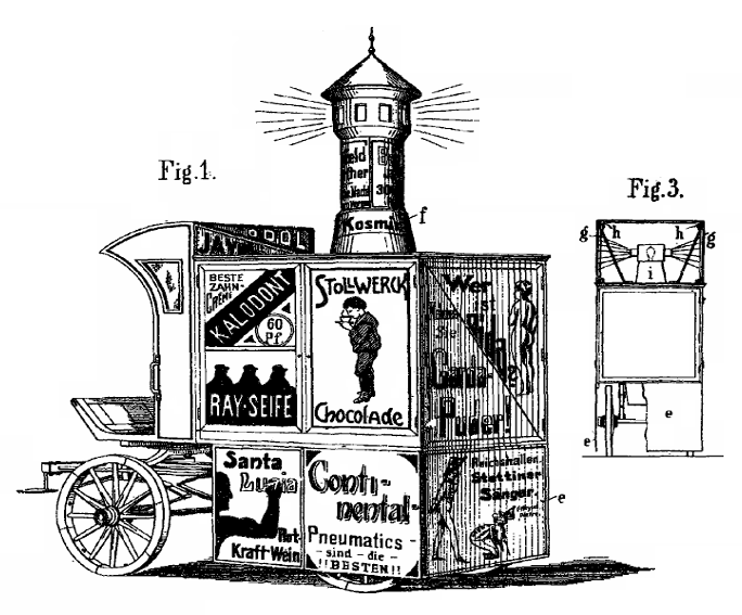当時欧州ではマジックランタンと呼ばれる映像投影器が普及し、自動車に搭載して宣伝に用いることが流行ります。1904年の特許に当時の宣伝広告車の様子が描かれ、内部にマジックランタンを配置して車体外装に映像を投影するアイデアが示されます